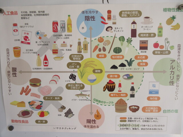 次に、「食のバランスシート」(添付)を見ながら食品についてアルカリ性・酸性、陰性・陽性を、また、肝臓に負担をかけないために氣をつけたほうが良いことも教えていただきました。